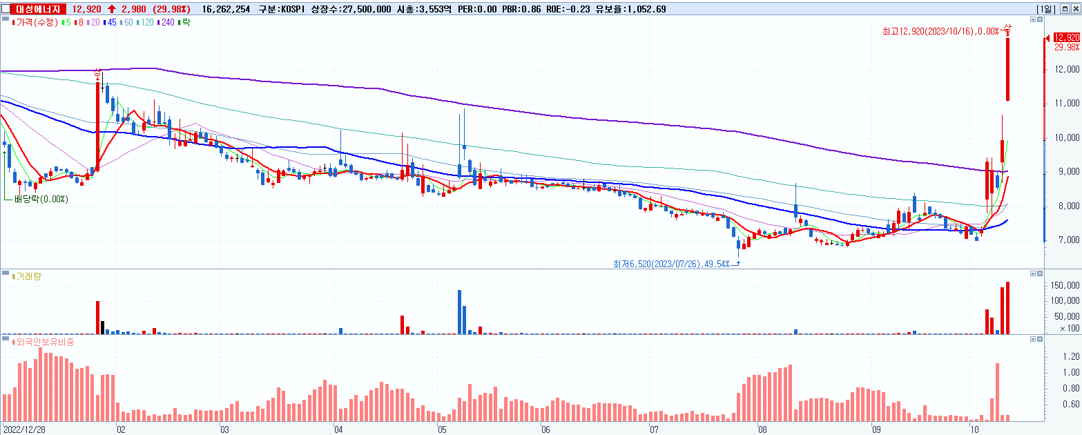 - 대성에너지 (12,920원 ▲ 29.98% , 시총: 3,553억, 거래량: 16,270,548, 거래대금:1,996억)