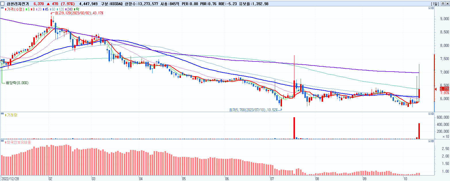 - 삼천리자전거 (6,370원 ▲ 7.97% , 시총: 846억, 거래량: 4,449,566, 거래대금:305억)