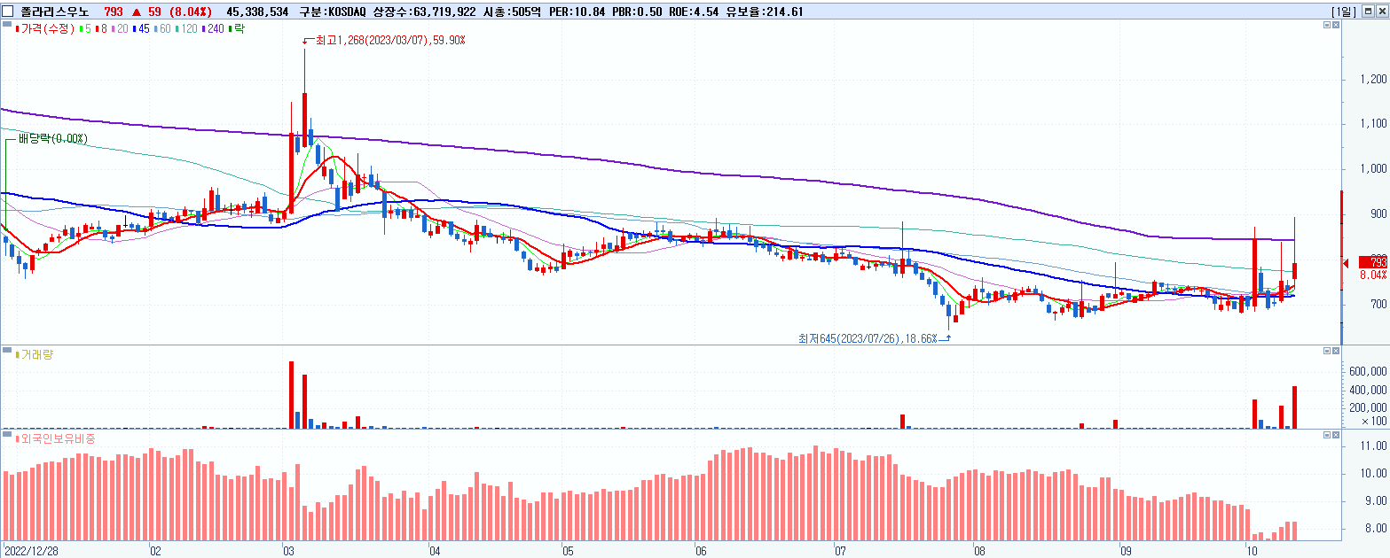 - 폴라리스우노 (793원 ▲ 8.04% , 시총: 505억, 거래량: 45,508,337, 거래대금:372억)