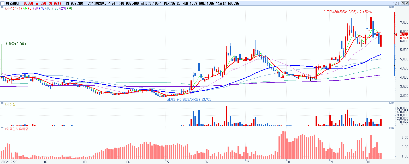 - 에스와이 (6,350원 ▲ 8.92% , 시총: 3,106억, 거래량: 20,166,547, 거래대금:1,243억)