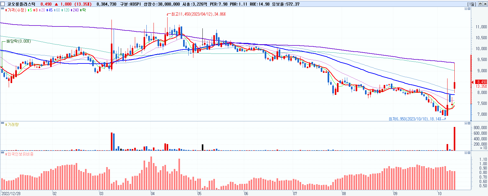 - 코오롱플라스틱 (8,490원 ▲ 13.35% , 시총: 3,226억, 거래량: 8,407,091, 거래대금:752억)