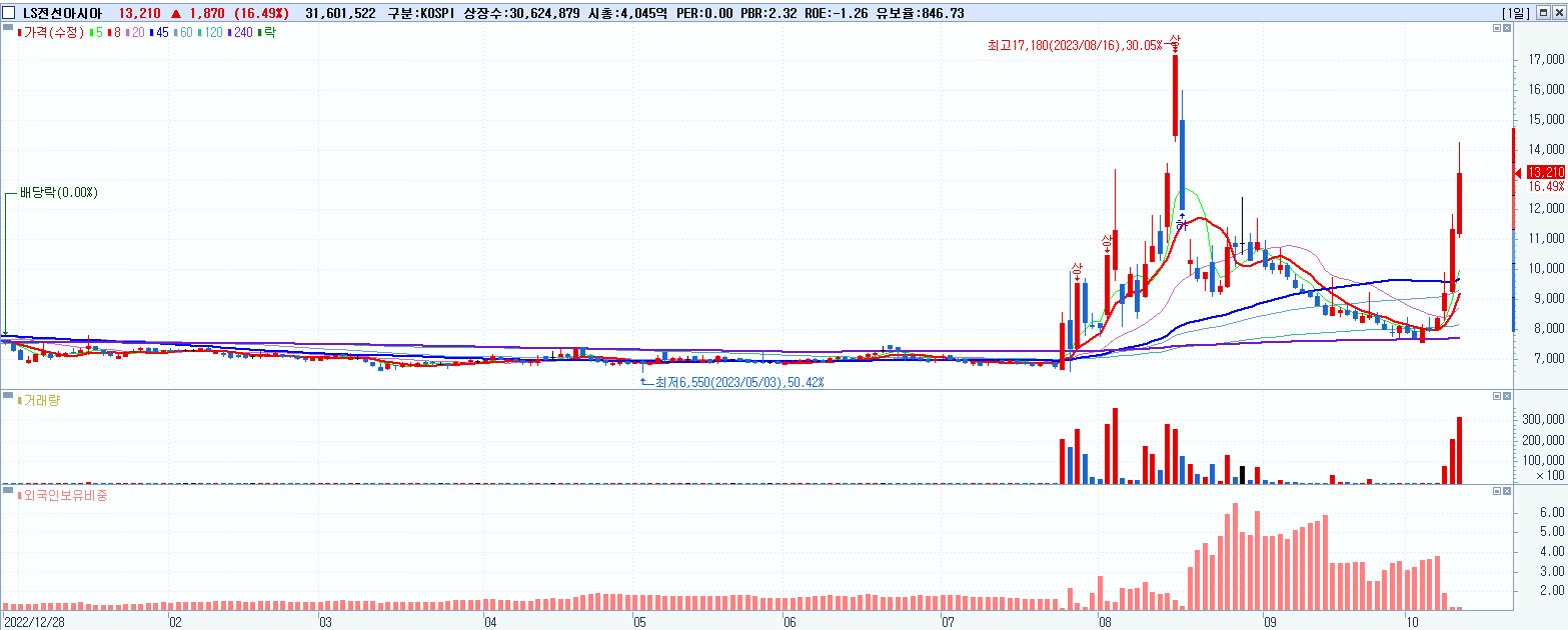 - LS전선아시아 (13,210원 ▲ 16.49% , 시총: 4,046억, 거래량: 31,678,458, 거래대금:4,118억)