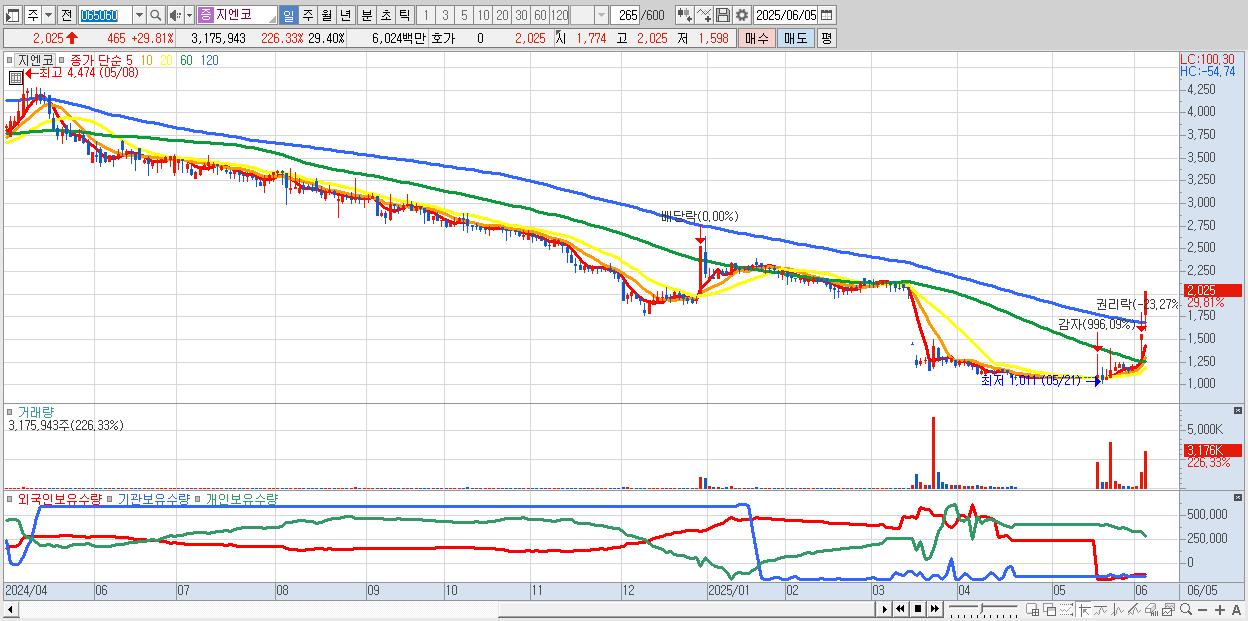 - 지엔코 (2,025원 ▲ 29.81% , 시총: 219억, 거래량: 3,175,943, 거래대금:60억)
