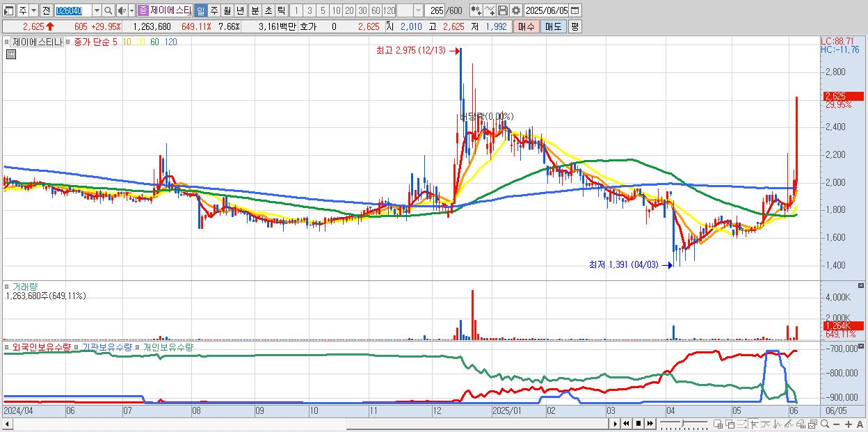 - 제이에스티나 (2,625원 ▲ 29.95% , 시총: 433억, 거래량: 1,263,680, 거래대금:32억)