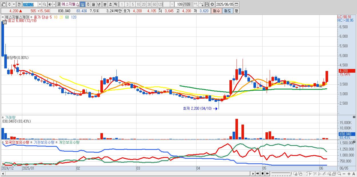 - 에스지헬스케어 (4,200원 ▲ 15.54% , 시총: 469억, 거래량: 838,040, 거래대금:32억)