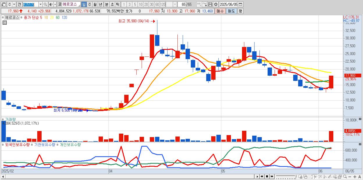 - 에르코스 (17,960원 ▲ 29.96% , 시총: 1,319억, 거래량: 4,884,529, 거래대금:786억)