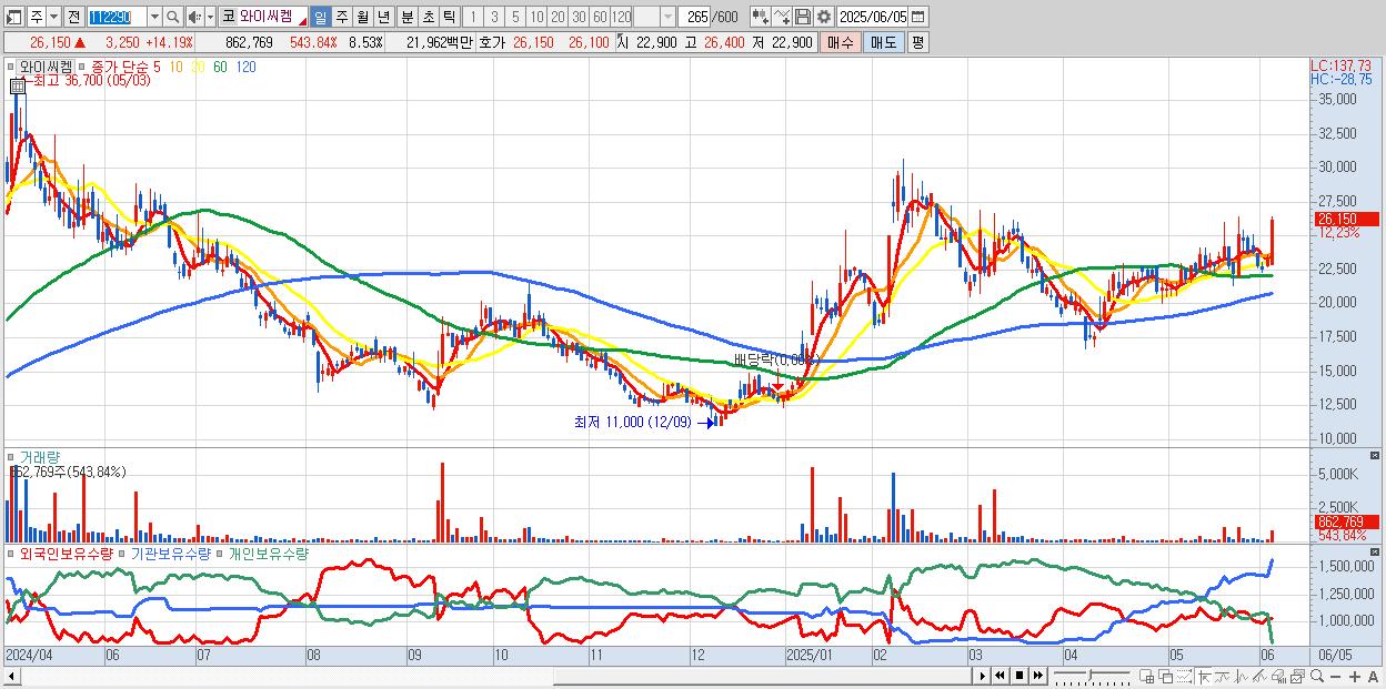 - 와이씨켐 (26,150원 ▲ 14.19% , 시총: 2,644억, 거래량: 560,624, 거래대금:143억)