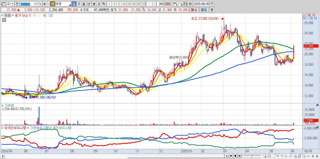 - 태광 (21,650원 ▲ 13.65% , 시총: 5,737억, 거래량: 1,497,852, 거래대금:313억)