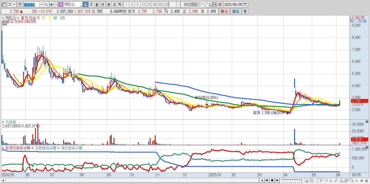 - 카티스 (2,730원 ▲ 13.51% , 시총: 521억, 거래량: 2,437,269, 거래대금:67억)