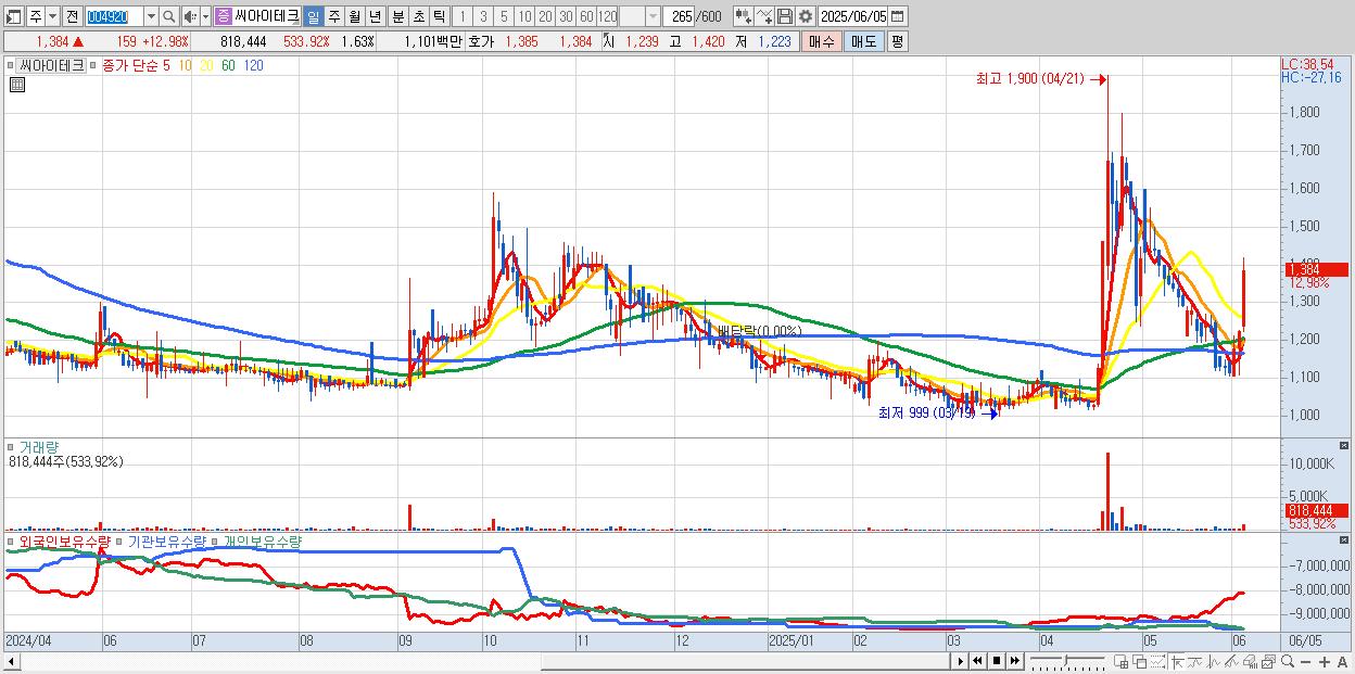 - 씨아이테크 (1,384원 ▲ 12.98% , 시총: 693억, 거래량: 818,444, 거래대금:11억)