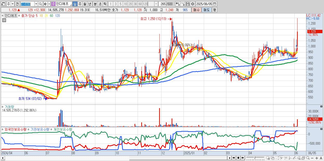 - 인디에프 (1,129원 ▲ 12.9% , 시총: 848억, 거래량: 14,505,278, 거래대금:165억)