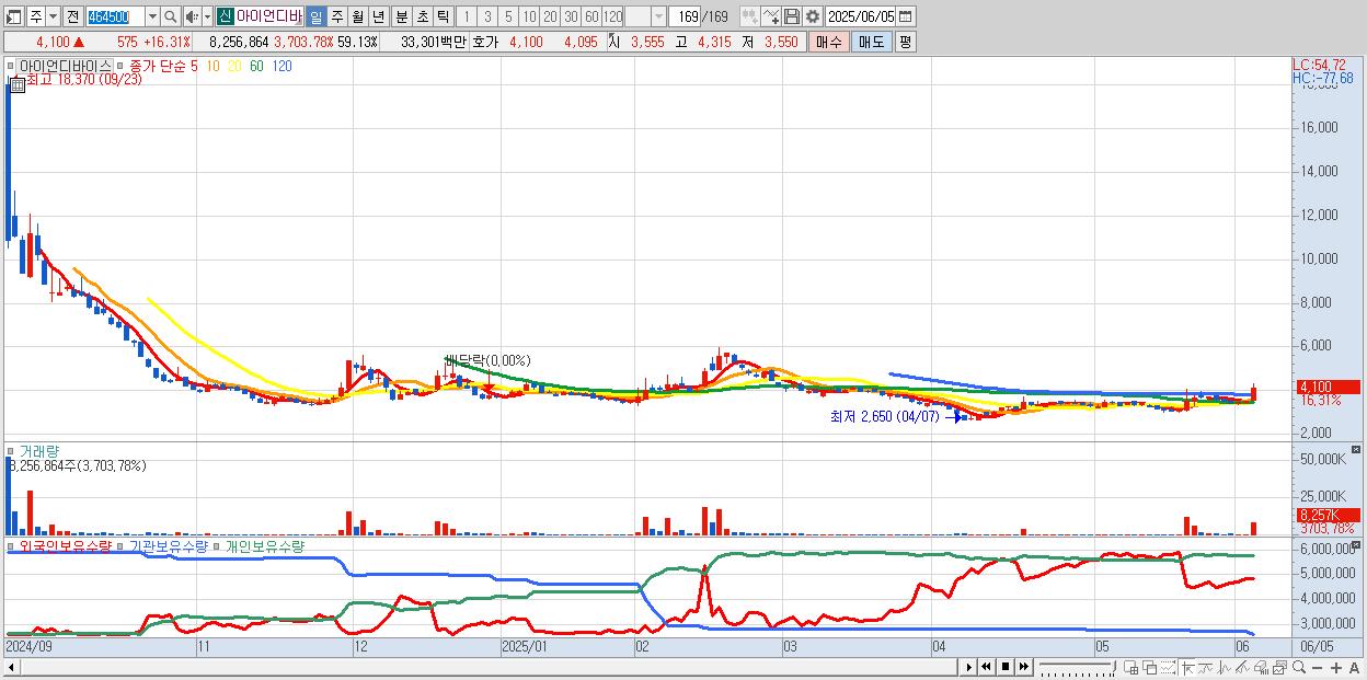 - 아이언디바이스 (4,100원 ▲ 16.31% , 시총: 572억, 거래량: 8,256,864, 거래대금:333억)