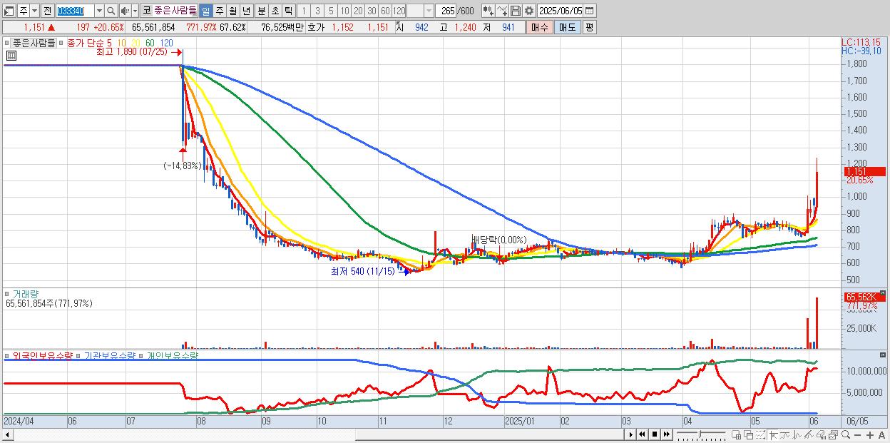 - 좋은사람들 (1,151원 ▲ 20.65% , 시총: 1,116억, 거래량: 65,561,854, 거래대금:765억)
