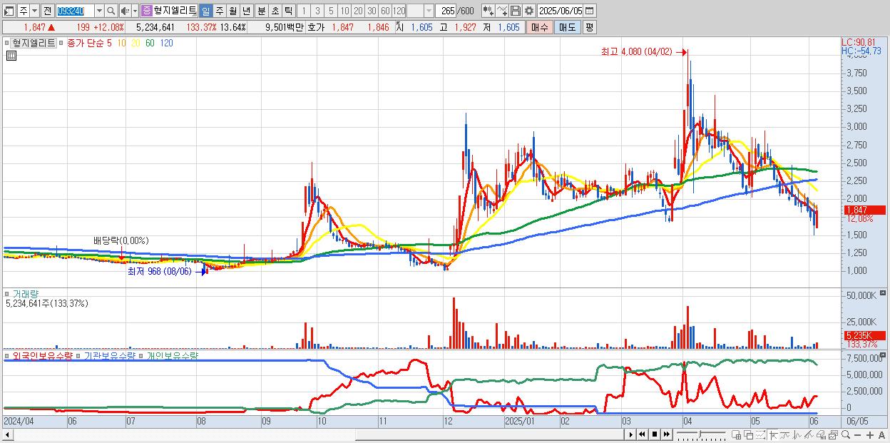- 형지엘리트 (1,847원 ▲ 12.08% , 시총: 709억, 거래량: 5,234,641, 거래대금:95억)