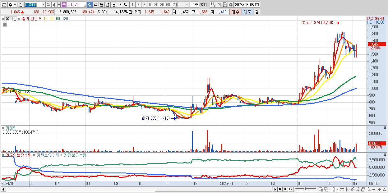 - 유니슨 (1,645원 ▲ 12.9% , 시총: 2,804억, 거래량: 8,860,625, 거래대금:141억)