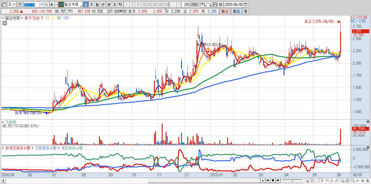 - 일신석재 (2,655원 ▲ 18.79% , 시총: 2,056억, 거래량: 85,757,771, 거래대금:2,279억)