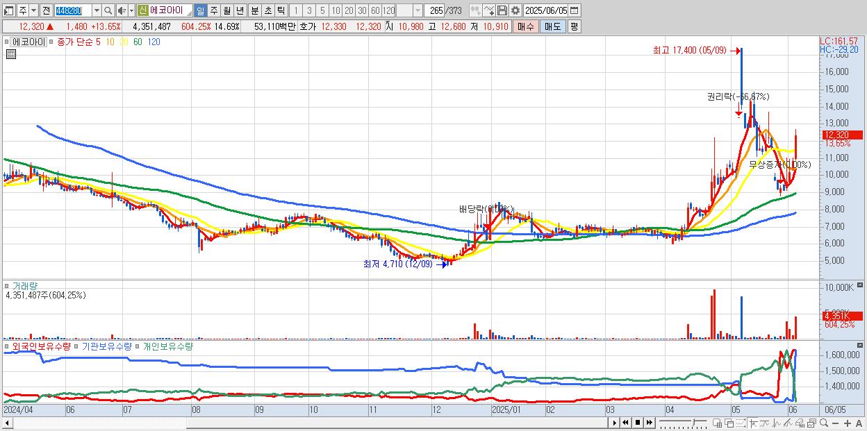 - 에코아이 (12,320원 ▲ 13.65% , 시총: 3,651억, 거래량: 4,351,487, 거래대금:531억)