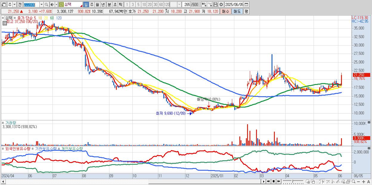 - 심텍 (21,300원 ▲ 17.87% , 시총: 6,785억, 거래량: 2,152,364, 거래대금:442억)
