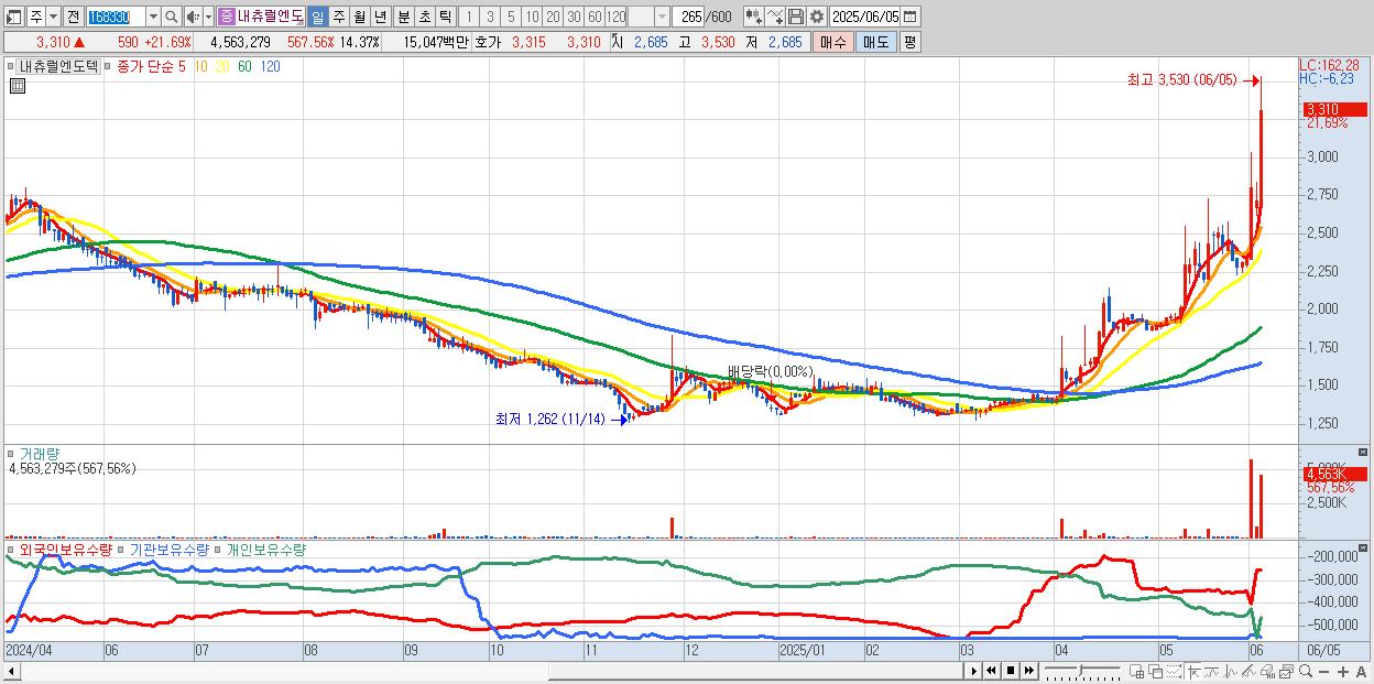 - 내츄럴엔도텍 (3,310원 ▲ 21.69% , 시총: 1,051억, 거래량: 4,563,279, 거래대금:150억, KOSDAQ)