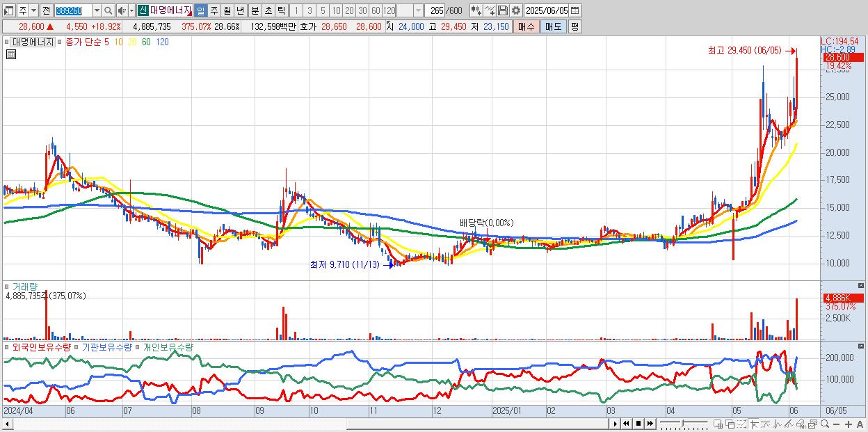 - 대명에너지 (27,500원 ▲ 14.35% , 시총: 4,689억, 거래량: 2,127,744, 거래대금:565억, KOSDAQ)