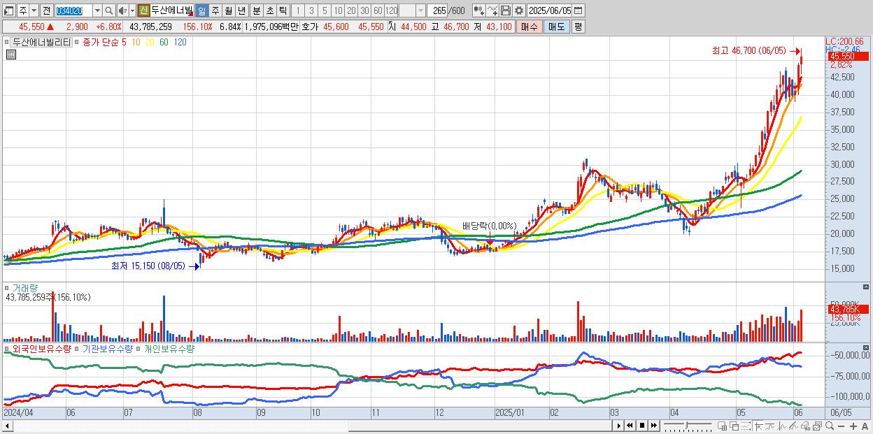- 두산에너빌리티 (45,900원 ▲ 7.62% , 시총: 294,018억, 거래량: 20,061,143, 거래대금:9,019억, KOSPI)