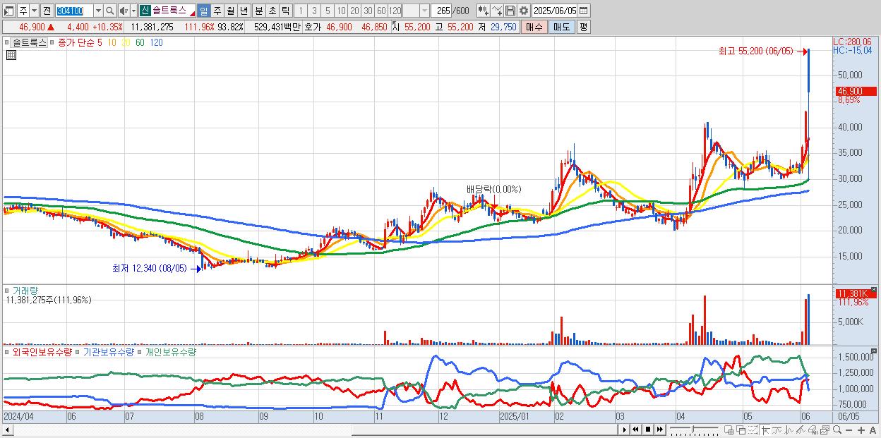 - 솔트룩스 (47,850원 ▲ 12.59% , 시총: 5,804억, 거래량: 6,098,888, 거래대금:2,853억, KOSDAQ)