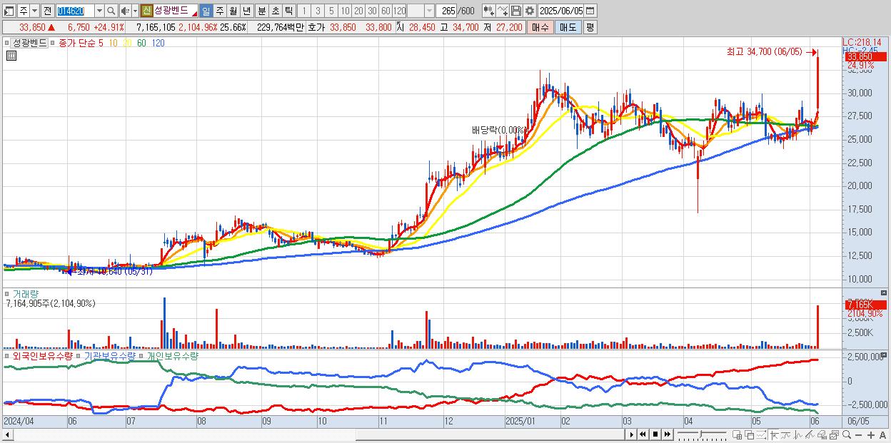 - 성광벤드 (34,050원 ▲ 25.65% , 시총: 9,510억, 거래량: 4,427,774, 거래대금:1,420억, KOSDAQ)