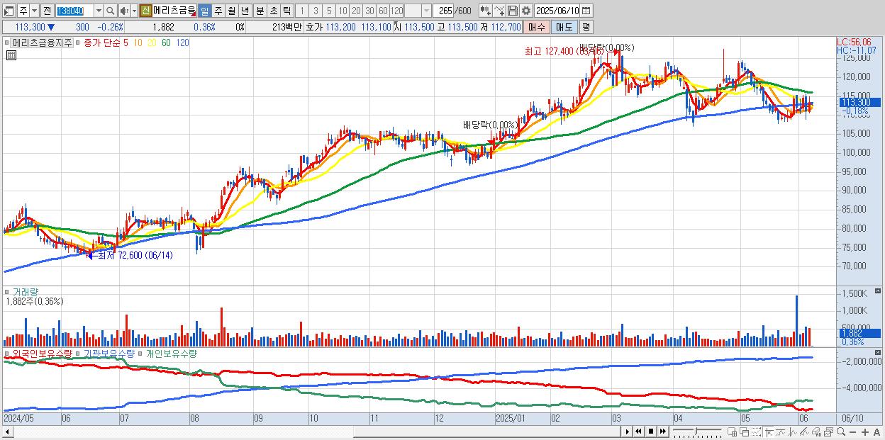 - 메리츠금융지주 (113,600원 ▲ 2.25% , 시총: 204,496억, 외국인 순매수 거래금:126억)
