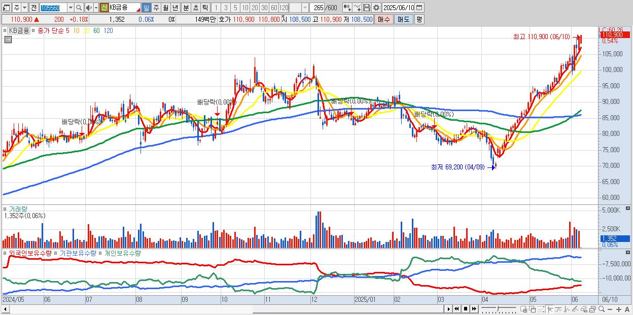 - KB금융 (110,700원 ▲ 4.14% , 시총: 422,279억, 거래량: 2,084,938, 거래대금:2,279억, KOSPI)