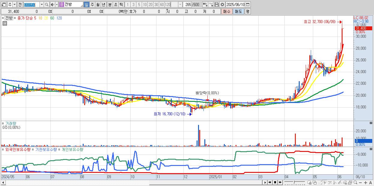 - 전방 (31,400원 ▲ 14.81% , 시총: 528억, 거래량: 11,778, 거래대금:4억, KOSPI)