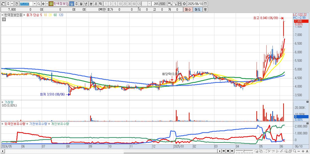 - 한국정보인증 (7,800원 ▲ 26.01% , 시총: 3,310억, 거래량: 27,001,030, 거래대금:2,060억, KOSDAQ)