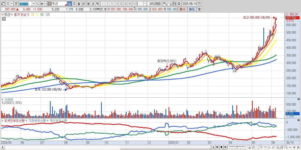 - 두산 (588,000원 ▲ 7.1% , 시총: 97,160억, 거래량: 260,282, 거래대금:1,538억, KOSPI)