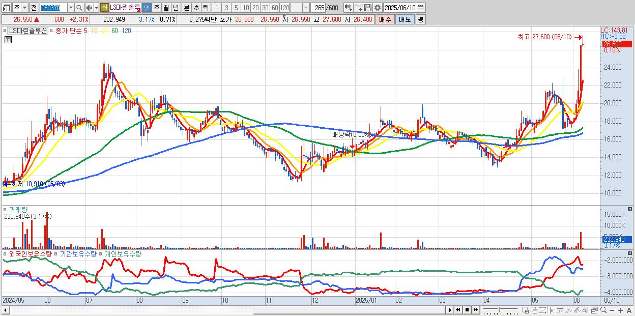 - LS마린솔루션 (25,950원 ▲ 26.89% , 시총: 8,478억, 거래량: 3,724,166, 거래대금:915억, KOSDAQ)