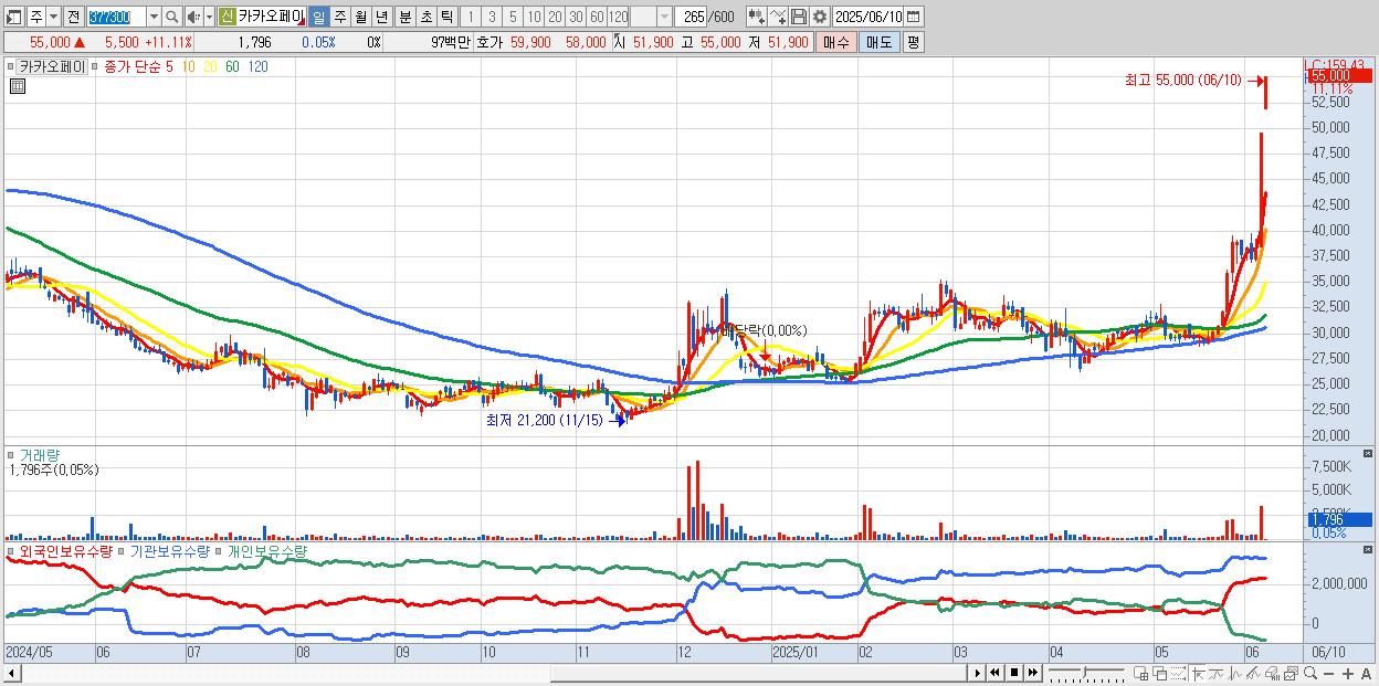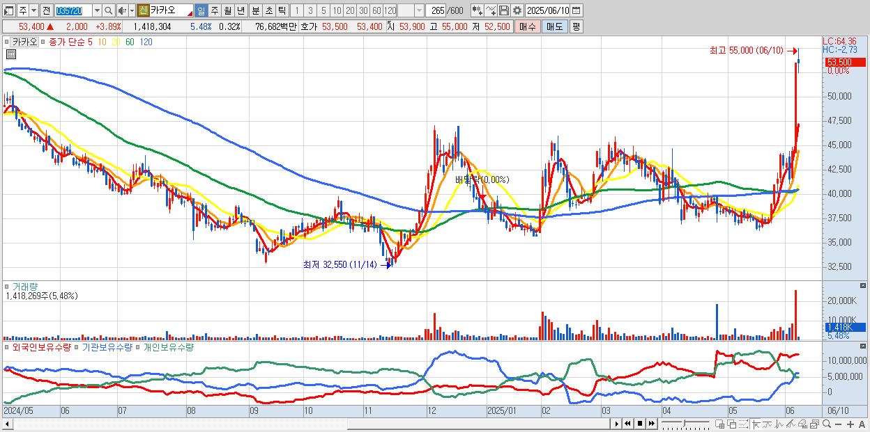- 카카오 (51,400원 ▲ 16.03% , 시총: 227,040억, 거래량: 12,784,767, 거래대금:6,310억, KOSPI)