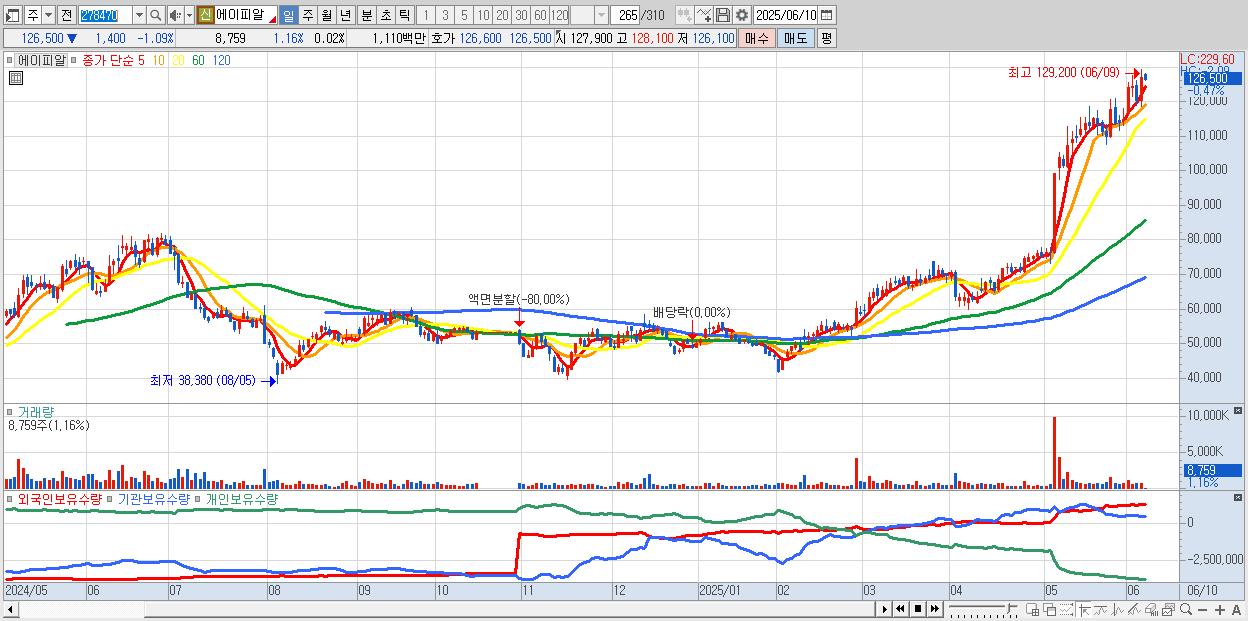 - 에이피알 (127,900원 ▲ 5.88% , 시총: 48,150억, 거래량: 504,906, 거래대금:629억, KOSPI)