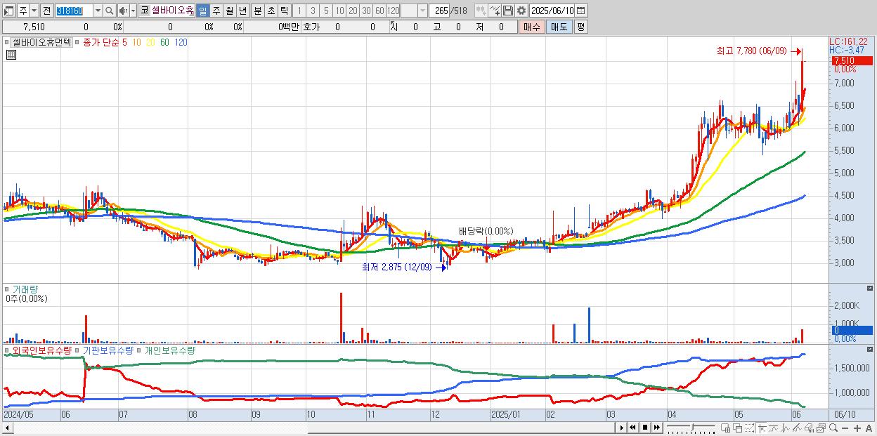 - 셀바이오휴먼텍 (7,510원 ▲ 17.34% , 시총: 695억, 거래량: 714,347, 거래대금:53억, KOSDAQ)
