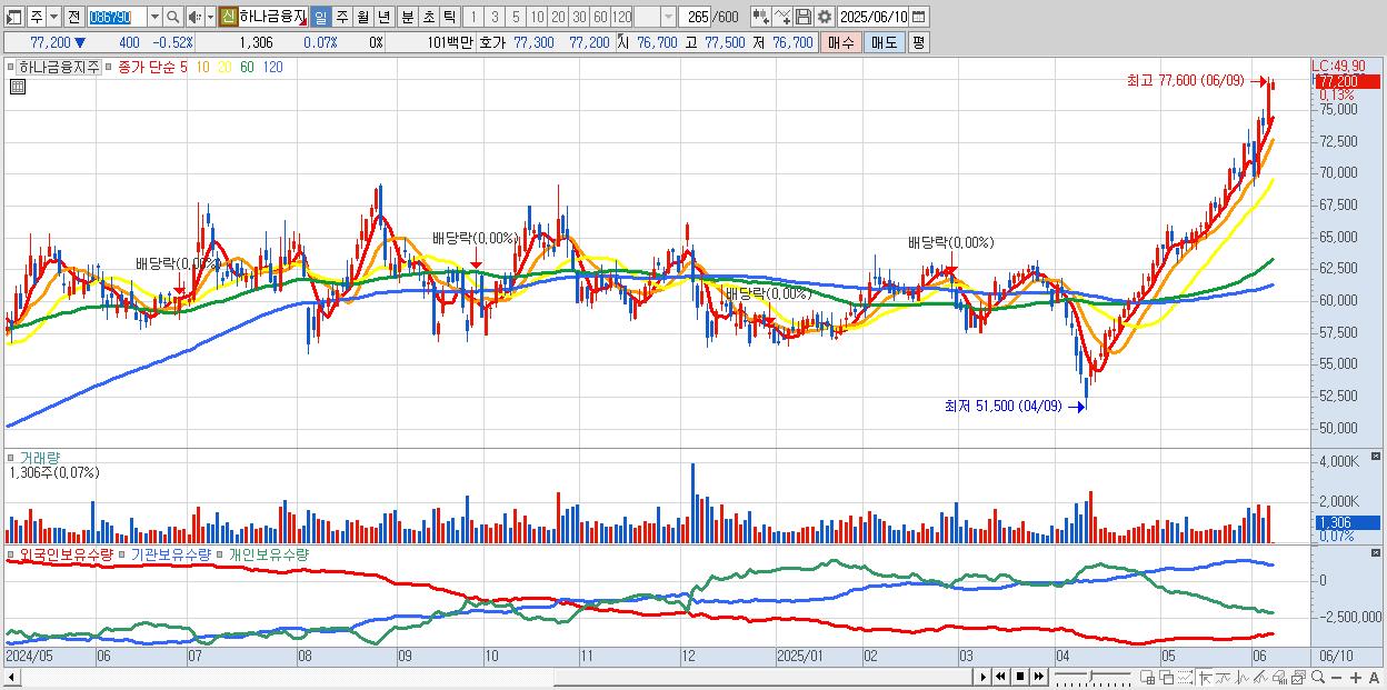 - 하나금융지주 (77,600원 ▲ 5.58% , 시총: 220,946억, 거래량: 1,670,019, 거래대금:1,280억, KOSPI)