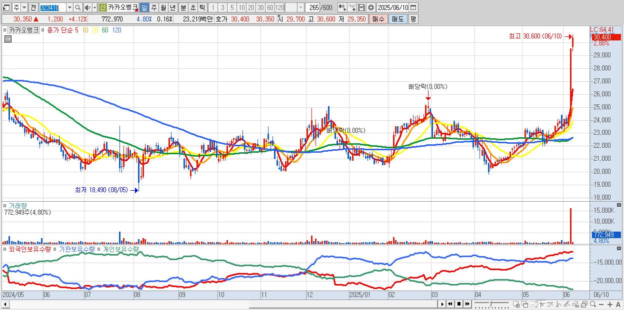 - 카카오뱅크 (29,150원 ▲ 20.21% , 시총: 139,042억, 거래량: 8,989,144, 거래대금:2,542억, KOSPI)