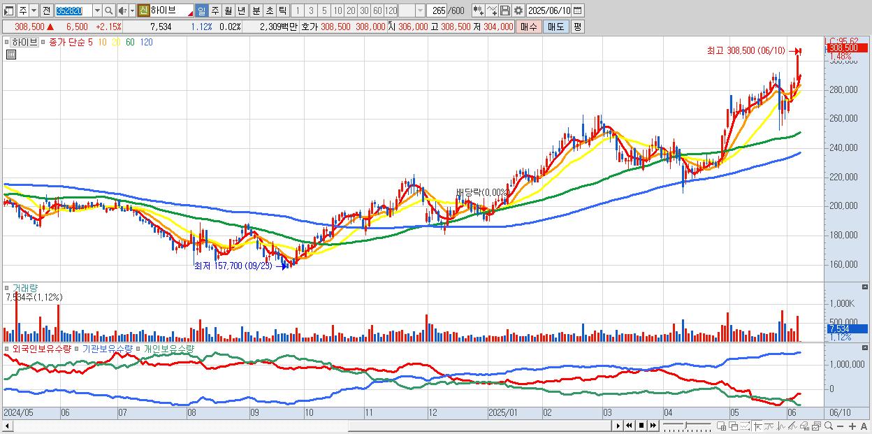 - 하이브 (302,000원 ▲ 6.15% , 시총: 125,789억, 거래량: 453,290, 거래대금:1,364억)