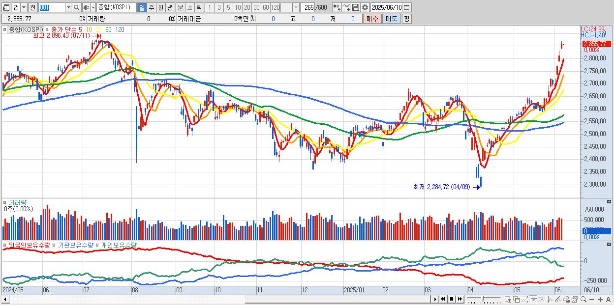 | 06/09 | 2,855.77 | ▲1.55% | -2,301억 | 9,767억 | -7,332억 | -134억 |