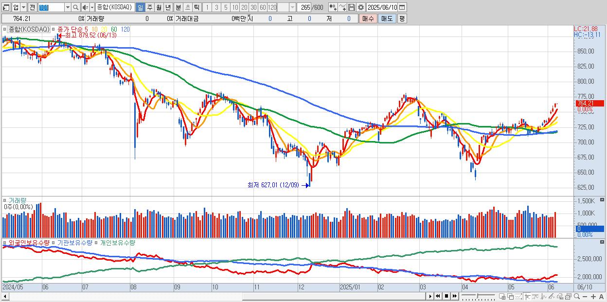 | 06/09 | 764.21 | ▲1.06% | -1,042억 | 1,527억 | -388억 | -96억 |