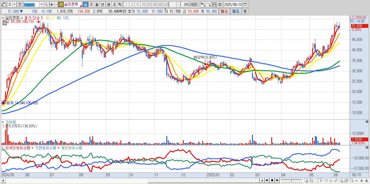 - 실리콘투 (51,800원 ▲ 0.19% , 시총: 31,687억, 외국인 순매수 거래금:137억)