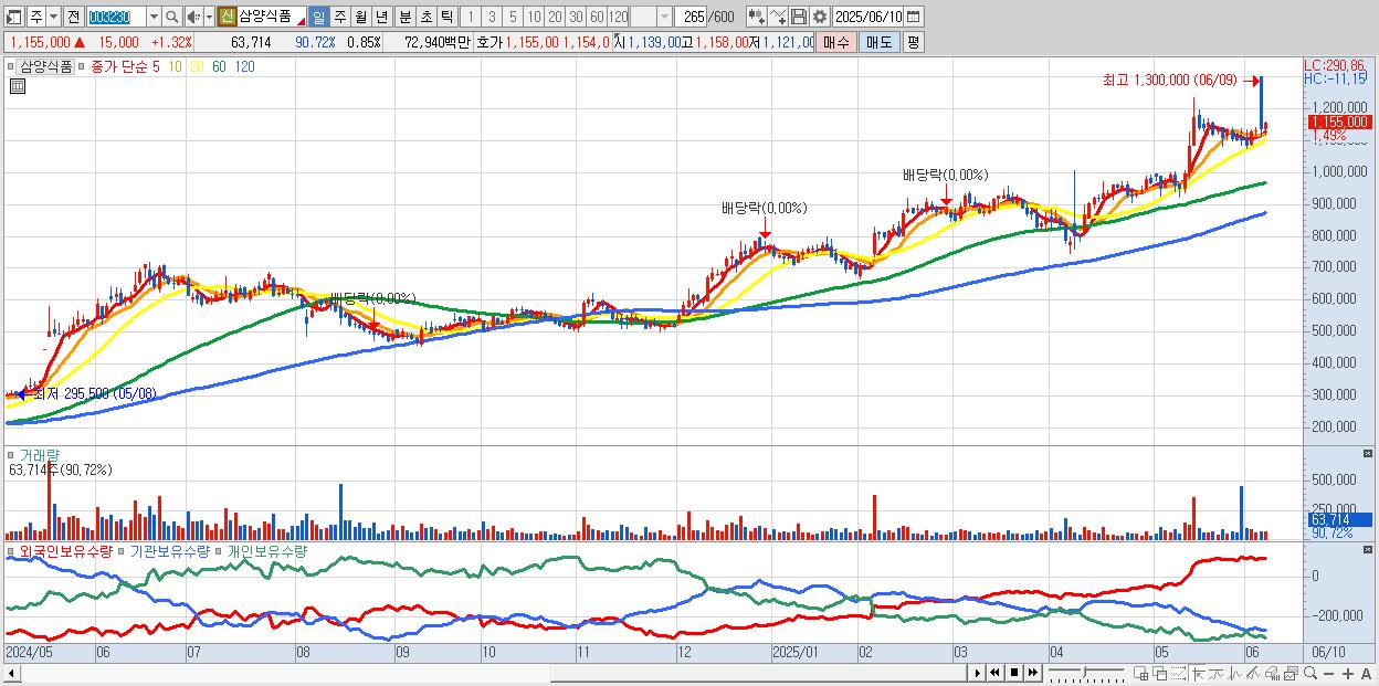 - 삼양식품 (1,157,000원 ▲ 1.49% , 시총: 87,157억, 외국인 순매수 거래금:102억)