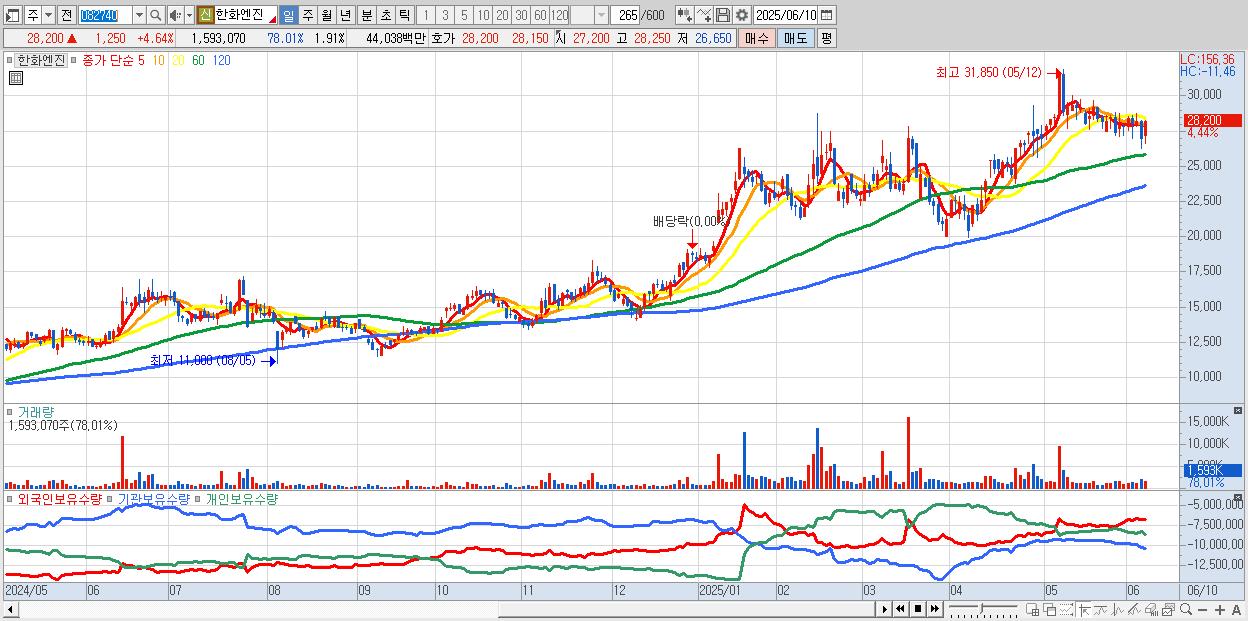 - 한화엔진 (28,050원 ▲ 4.08% , 시총: 23,407억, 외국인 순매수 거래금:112억)