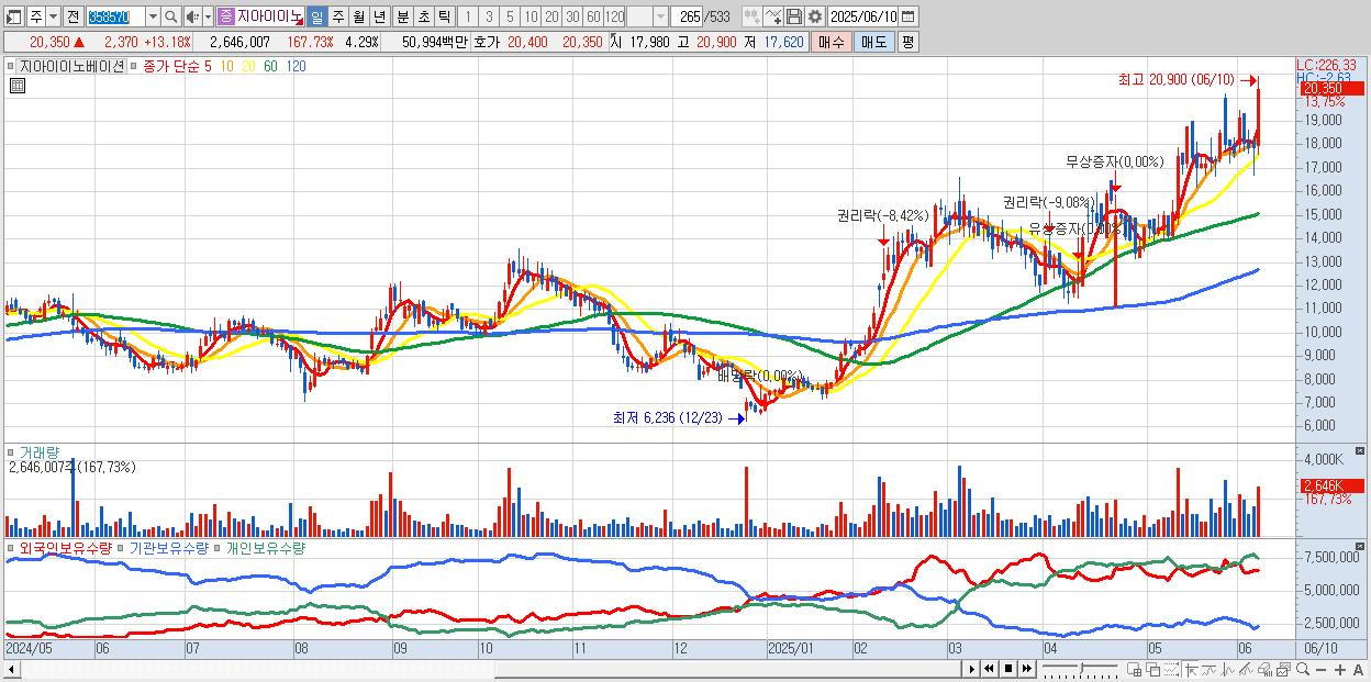 - 지아이이노베이션 (20,800원 ▲ 15.68% , 시총: 12,816억, 거래량: 1,771,810, 거래대금:341억, KOSDAQ)