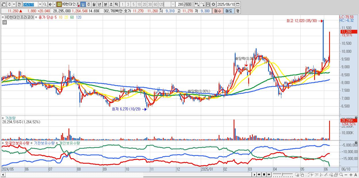 - HD현대인프라코어 (10,970원 ▲ 16.95% , 시총: 21,127억, 거래량: 16,638,079, 거래대금:1,774억, KOSPI)