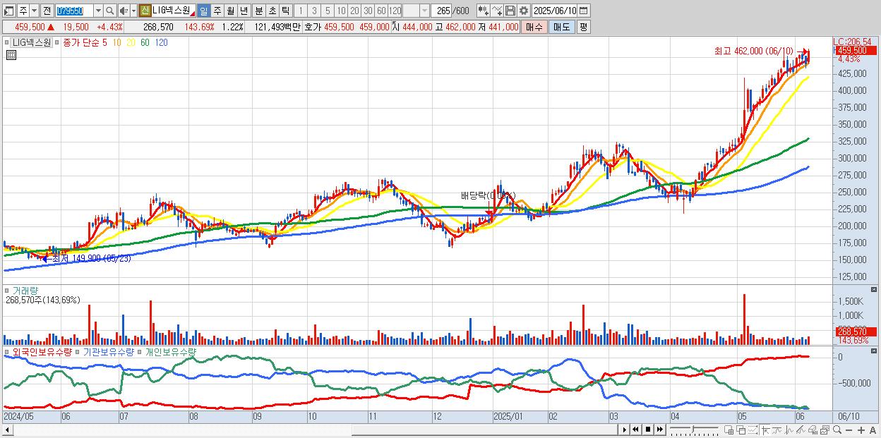 - LIG넥스원 (458,500원 ▲ 4.2% , 시총: 100,870억, 거래량: 193,581, 거래대금:876억, KOSPI)