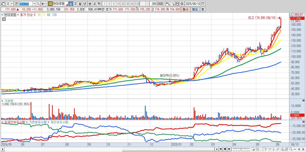 - 현대로템 (168,300원 ▲ 9.71% , 시총: 183,686억, 거래량: 1,884,303, 거래대금:3,111억, KOSPI)