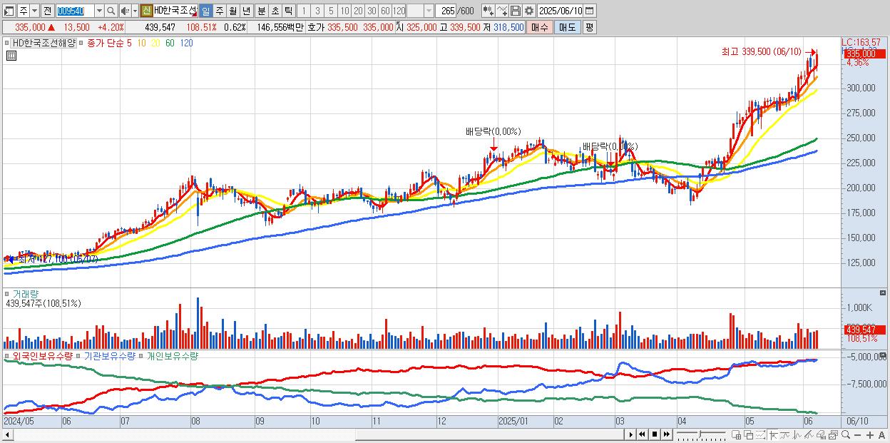 - HD한국조선해양 (335,500원 ▲ 4.35% , 시총: 237,444억, 거래량: 345,143, 거래대금:1,151억, KOSPI)