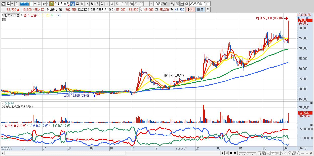 - 한화시스템 (51,400원 ▲ 20.09% , 시총: 97,105억, 거래량: 12,232,648, 거래대금:5,911억, KOSPI)